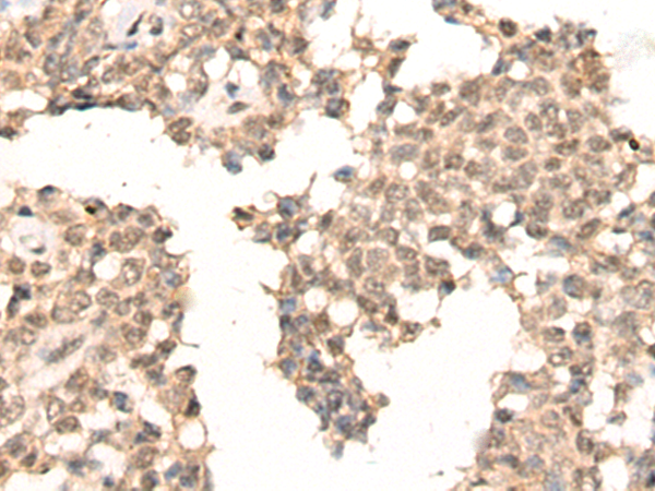 The image is immunohistochemistry of paraffin-embedded Human ovarian cancer tissue using P11722(PRKDC Antibody) at dilution 1/25. (Original magnification: ×200) |
