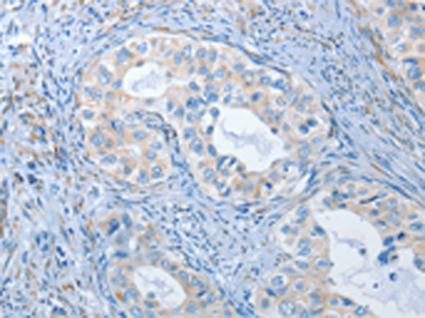 The image is immunohistochemistry of paraffin-embedded Human cervical cancer tissue using P11224(PRKG2 Antibody) at dilution 1/20. (Original magnification: ×200) |