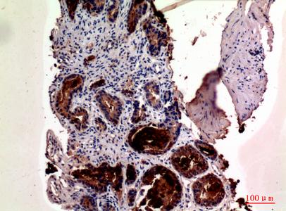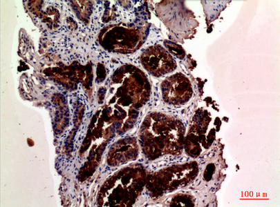 Immunohistochemistry analysis of paraffin-embedded Human prostatecancer using Prostate Specific Antigen antibody.High-pressure and temperature Sodium Citrate pH 6.0 was used for antigen retrieval. |