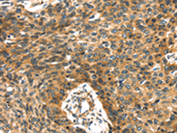 The image is immunohistochemistry of paraffin-embedded Human esophagus cancer tissue using P12337(PRSS50 Antibody) at dilution 1/30. (Original magnification: ×200) |