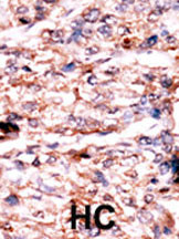 Formalin-fixed and paraffin-embedded human cancer tissue reacted with the primary antibody, which was peroxidase-conjugated to the secondary antibody, followed by AEC staining. This data demonstrates the use of this antibody for immunohistochemistry; clinical relevance has not been evaluated. BC = breast carcinoma; HC = hepatocarcinoma. |
