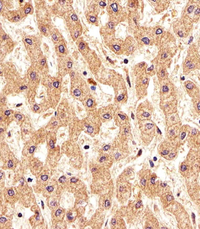 Immunohistochemical analysis of paraffin-embedded H. liver section using PSMAL Antibody (Center)(Cat#P32779). P32779 was diluted at 1:25 dilution. A undiluted biotinylated goat polyvalent antibody was used as the secondary, followed by DAB staining. |
