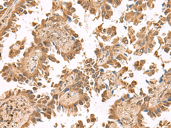 The image is immunohistochemistry of paraffin-embedded Human lung cancer tissue using P03098(PTH1R Antibody) at dilution 1/55. (Original magnification: ×200) |