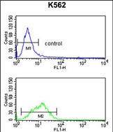 PTHLH Antibody (Center) (Cat. #P30368) flow cytometry analysis of K562 cells (bottom histogram) compared to a negative control cell (top histogram).FITC-conjugated goat-anti-rabbit secondary antibodies were used for the analysis. |