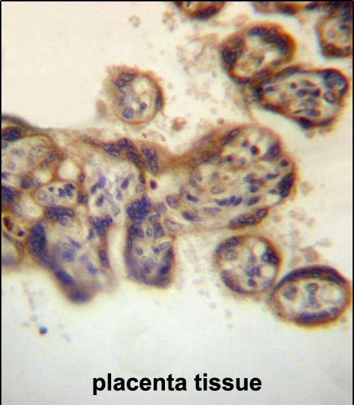 PTPN2 Antibody (C-term) (Cat. #P31264)immunohistochemistry analysis in formalin fixed and paraffin embedded human placenta tissue followed by peroxidase conjugation of the secondary antibody and DAB staining.This data demonstrates the use of PTPN2 Antibody (C-term) for immunohistochemistry. Clinical relevance has not been evaluated. |