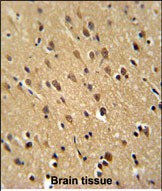 PUR4 Antibody (N-term) (Cat. #P33442) immunohistochemistry analysis in formalin fixed and paraffin embedded human brain tissue followed by peroxidase conjugation of the secondary antibody and DAB staining. This data demonstrates the use of the PUR4 Antibody (N-term) for immunohistochemistry. Clinical relevance has not been evaluated. |