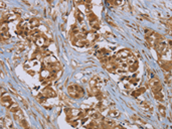The image is immunohistochemistry of paraffin-embedded Human breast cancer tissue using P05198(PUS10 Antibody) at dilution 1/45. (Original magnification: ×200) |