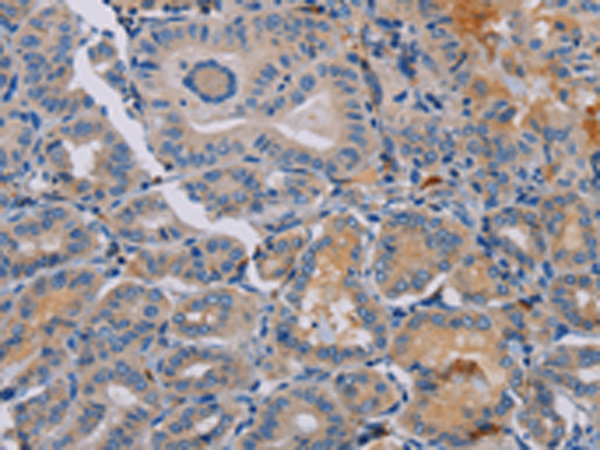The image is immunohistochemistry of paraffin-embedded Human thyroid cancer tissue using P05152(PYY Antibody) at dilution 1/30. (Original magnification: ×200) |
