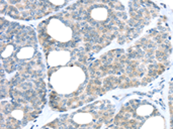 The image is immunohistochemistry of paraffin-embedded Human thyroid cancer tissue using P12092(RAB24 Antibody) at dilution 1/45. (Original magnification: ×200) |