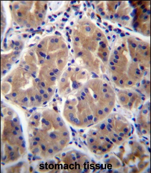 RAB27B Antibody (Center) (Cat. #P31143)immunohistochemistry analysis in formalin fixed and paraffin embedded human stomach tissue followed by peroxidase conjugation of the secondary antibody and DAB staining.This data demonstrates the use of RAB27B Antibody (Center) for immunohistochemistry. Clinical relevance has not been evaluated. |
