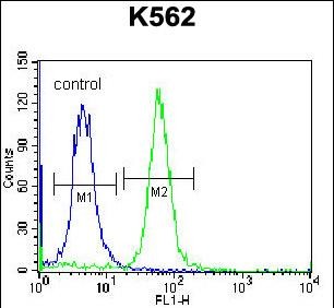 RAB3D Antibody (C-term) (Cat. #P31242) flow cytometric analysis of K562 cells (right histogram) compared to a negative control cell (left histogram).FITC-conjugated donkey-anti-rabbit secondary antibodies were used for the analysis. |