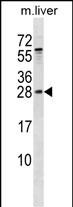 RAB5B Antibody (Center) (Cat. #P32008) western blot analysis in mouse liver tissue lysates (35ug/lane).This demonstrates the RAB5B antibody detected the RAB5B protein (arrow). |