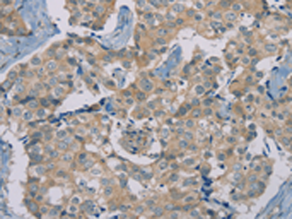 The image is immunohistochemistry of paraffin-embedded Human breast cancer tissue using P12093(RAD51 Antibody) at dilution 1/40. (Original magnification: ×200) |