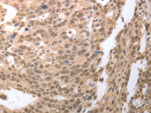 The image is immunohistochemistry of paraffin-embedded Human ovarian cancer tissue using P11102(RAD52 Antibody) at dilution 1/50. (Original magnification: ×200) |