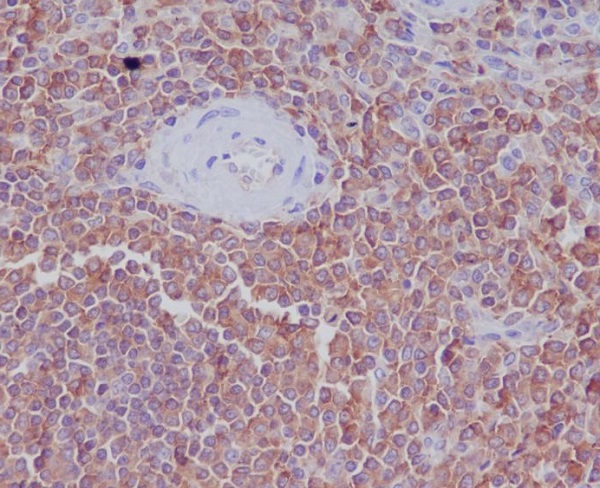 Immunohistochemistry analysis of paraffin-embedded Human spleen using Radixin antibody.High-pressure and temperature Sodium Citrate pH 6.0 was used for antigen retrieval. |
