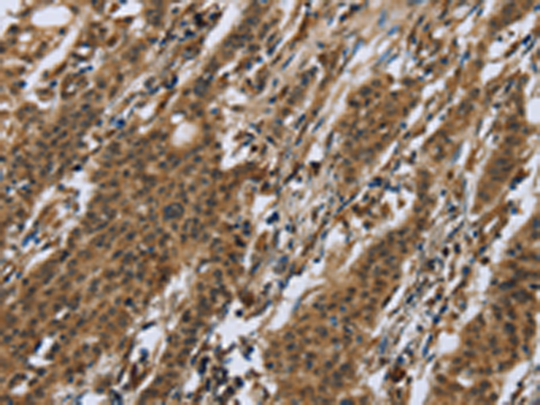 The image is immunohistochemistry of paraffin-embedded Human gastric cancer tissue using P07109(RAP1B Antibody) at dilution 1/50. (Original magnification: ×200) |