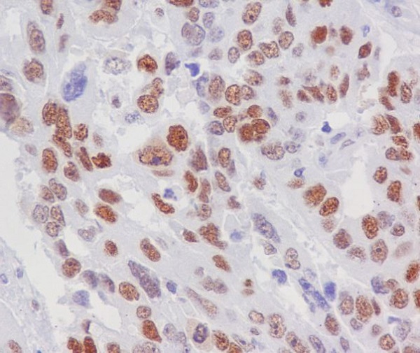 Immunohistochemistry analysis of paraffin-embedded Human lung cancer using Retinoblastoma antibody.High-pressure and temperature Sodium Citrate pH 6.0 was used for antigen retrieval. |