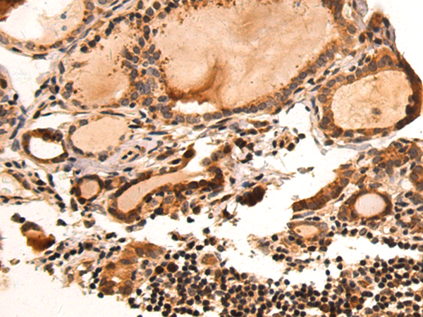 The image is immunohistochemistry of paraffin-embedded Human thyroid cancer tissue using P11064(RBFOX3 Antibody) at dilution 1/50. (Original magnification: ×200) |