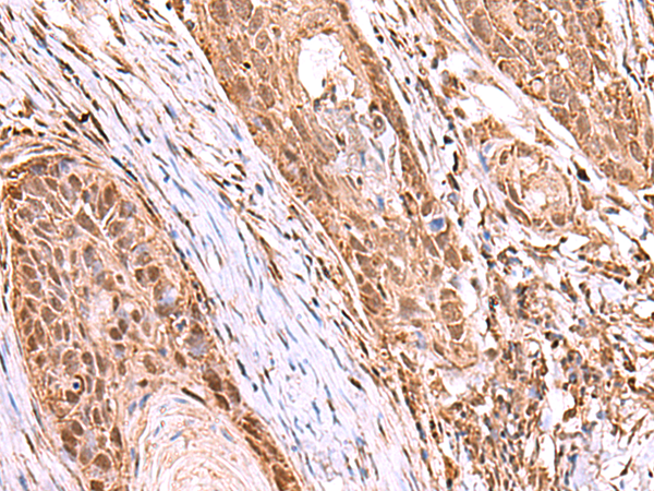 The image is immunohistochemistry of paraffin-embedded Human esophagus cancer tissue using P03157(RCOR3 Antibody) at dilution 1/55. (Original magnification: ×200) |