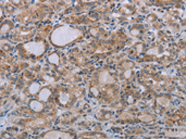 The image is immunohistochemistry of paraffin-embedded Human thyroid cancer tissue using P05053(REG3A Antibody) at dilution 1/20. (Original magnification: ×200) |