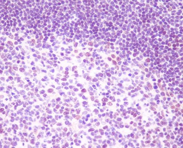 Immunohistochemistry analysis of paraffin-embedded Human tonsil using RelB antibody.High-pressure and temperature Sodium Citrate pH 6.0 was used for antigen retrieval. |