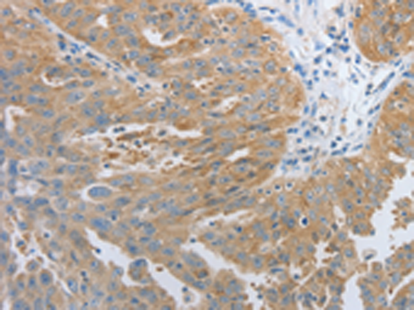 The image is immunohistochemistry of paraffin-embedded Human ovarian cancer tissue using P03753(RHEB Antibody) at dilution 1/30. (Original magnification: ×200) |