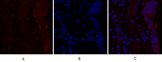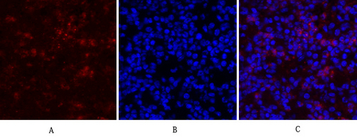 Immunofluorescence analysis of RhoA in rat lung using Rho A antibody(red),and DAPI (blue). |