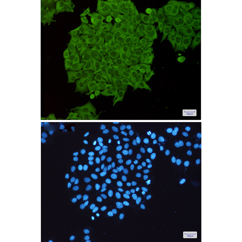 Immunocytochemistry analysis of Rho A/B/C(green) in Hela using Rho A/B/C antibody,and DAPI(blue) |