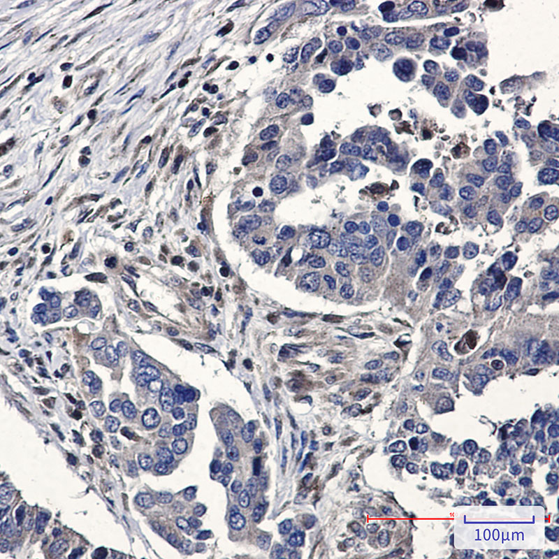 Immunohistochemistry analysis of paraffin-embedded Human Cholangiocarcinoma using RhoA/B/C antibody. High-pressure and temperature Sodium Citrate pH 6.0 was used for antigen retrieval. |