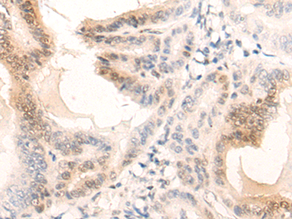 The image is immunohistochemistry of paraffin-embedded Human thyroid cancer tissue using P02747(RIOX2 Antibody) at dilution 1/20. (Original magnification: ×200) |