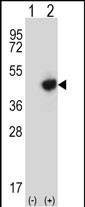 Western blot analysis of RMND5B (arrow) using rabbit polyclonal RMND5B Antibody (C-term) (Cat.#P30329). 293 cell lysates (2 ug/lane) either nontransfected (Lane 1) or transiently transfected (Lane 2) with the RMND5B gene. |