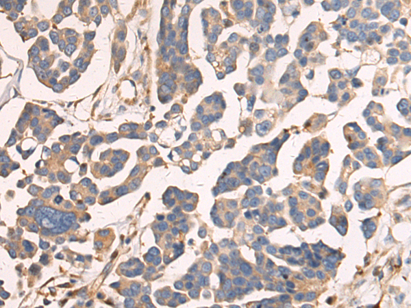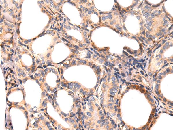 The image is immunohistochemistry of paraffin-embedded Human thyroid cancer tissue using P03584(RPS10 Antibody) at dilution 1/70. (Original magnification: ×200) |