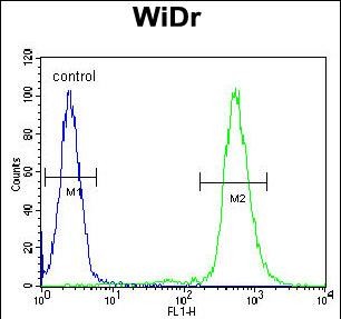 RPS6 Antibody (Ser240/244) (Cat. #P30754) flow cytometric analysis of WiDr cells (right histogram) compared to a negative control cell (left histogram).FITC-conjugated goat-anti-rabbit secondary antibodies were used for the analysis. |