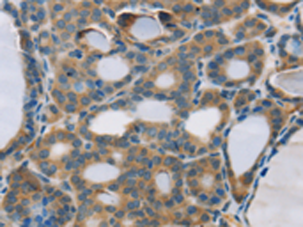 The image is immunohistochemistry of paraffin-embedded Human thyroid cancer tissue using P05238(RPS6KA2 Antibody) at dilution 1/20. (Original magnification: ×200) |