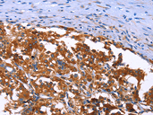 The image is immunohistochemistry of paraffin-embedded Human thyroid cancer tissue using P11221(RPS6KA6 Antibody) at dilution 1/20. (Original magnification: ×200) |