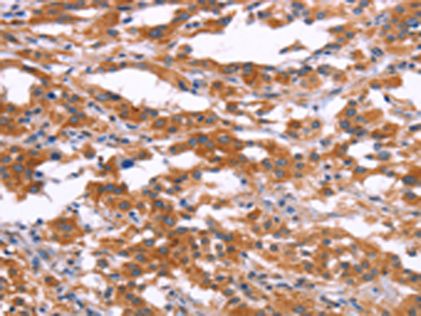 The image is immunohistochemistry of paraffin-embedded Human thyroid cancer tissue using P04313(RPS6KA6 Antibody) at dilution 1/30. (Original magnification: ×200) |