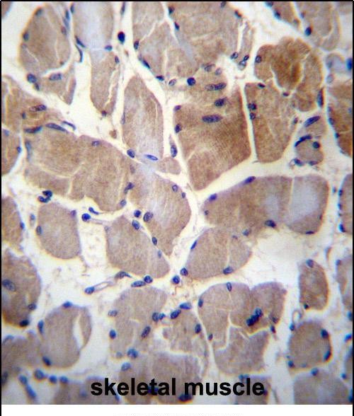 RPS6KC1 Antibody (N-term) (Cat. #P31090)immunohistochemistry analysis in formalin fixed and paraffin embedded human skeletal muscle followed by peroxidase conjugation of the secondary antibody and DAB staining.This data demonstrates the use of RPS6KC1 Antibody (N-term) for immunohistochemistry. Clinical relevance has not been evaluated. |