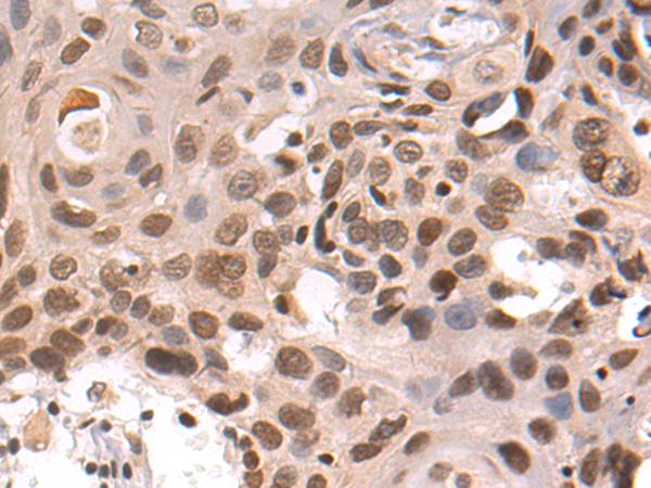 The image is immunohistochemistry of paraffin-embedded Human esophagus cancer tissue using P13723(RUNX2 Antibody) at dilution 1/50. (Original magnification: ×200) |