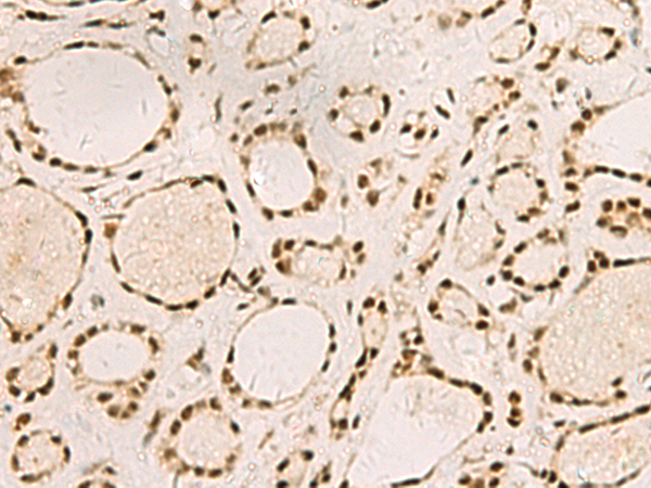 The image is immunohistochemistry of paraffin-embedded Human thyroid cancer tissue using P03362(SAP30BP Antibody) at dilution 1/45. (Original magnification: ×200) |