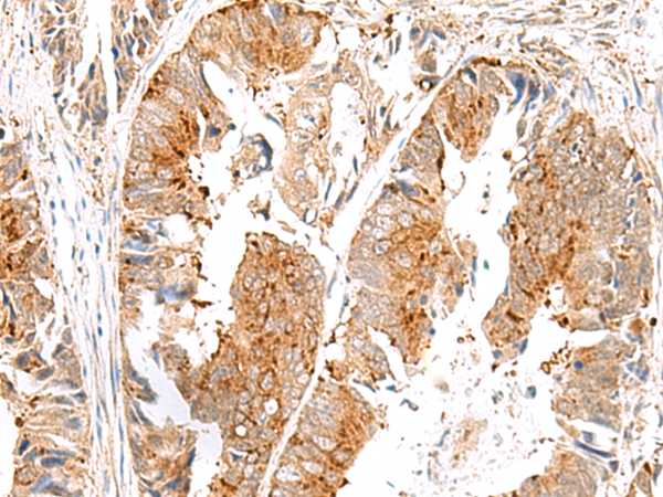 The image is immunohistochemistry of paraffin-embedded Human colorectal cancer tissue using P13381(SAXO2 Antibody) at dilution 1/45. (Original magnification: ×200) |