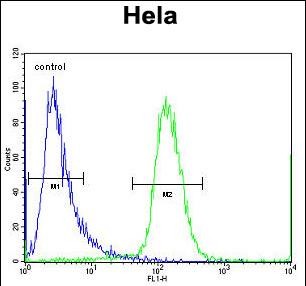 SCHIP1 Antibody (Center) (Cat. #P31177) flow cytometric analysis of Hela cells (right histogram) compared to a negative control cell (left histogram).FITC-conjugated goat-anti-rabbit secondary antibodies were used for the analysis. |