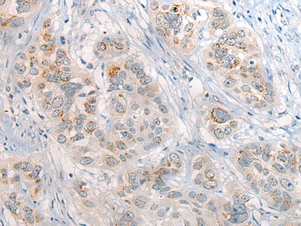 The image is immunohistochemistry of paraffin-embedded Human esophagus cancer tissue using P13149(SCN5A Antibody) at dilution 1/40. (Original magnification: ×200) |