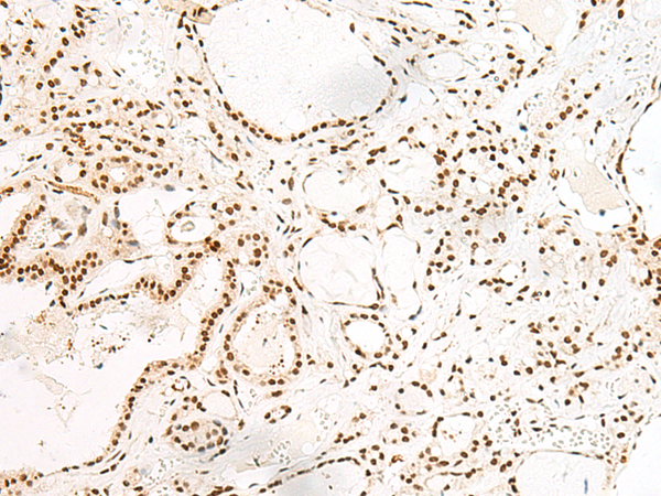 The image is immunohistochemistry of paraffin-embedded Human thyroid cancer tissue using P06612(SELL Antibody) at dilution 1/20. (Original magnification: ×200) |
