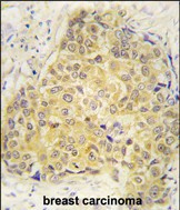 Formalin-fixed and paraffin-embedded human breast carcinoma tissue reacted with SEMA3A antibody (Center) (Cat.#P30289), which was peroxidase-conjugated to the secondary antibody, followed by DAB staining. This data demonstrates the use of this antibody for immunohistochemistry; clinical relevance has not been evaluated. |
