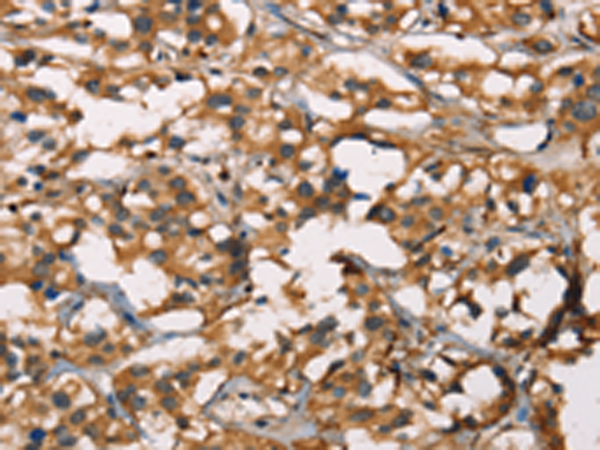 The image is immunohistochemistry of paraffin-embedded Human thyroid cancer tissue using P04653(SENP1 Antibody) at dilution 1/40. (Original magnification: ×200) |