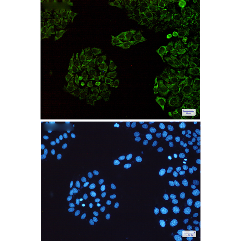 Immunocytochemistry analysis of SENP1(green) in Hela using SENP1 antibody,and DAPI(blue) |