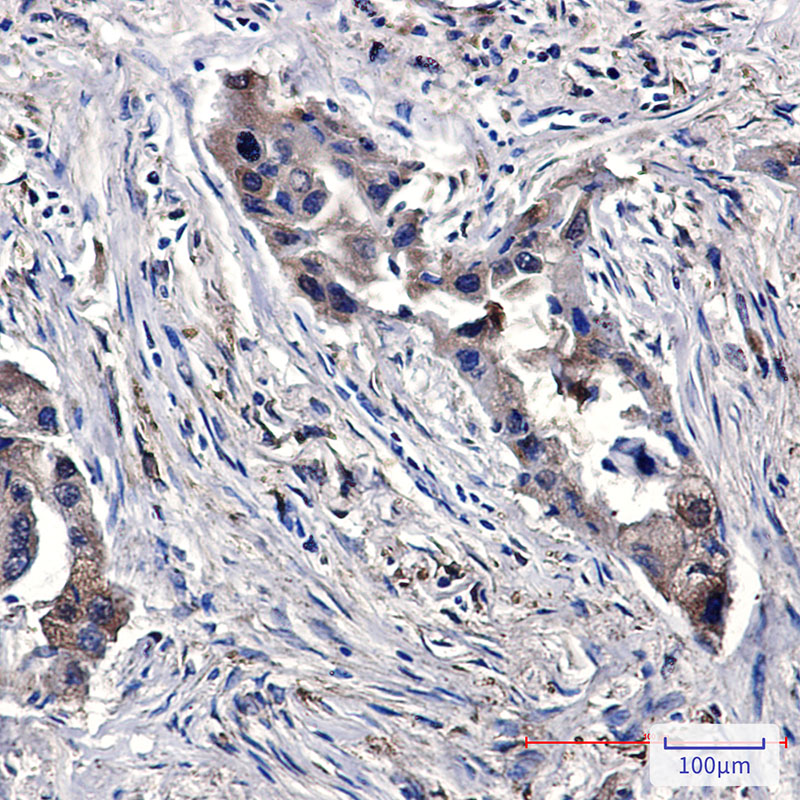 Immunohistochemistry analysis of paraffin-embedded Human lung cancer using SENP1 antibody. High-pressure and temperature Sodium Citrate pH 6.0 was used for antigen retrieval. |