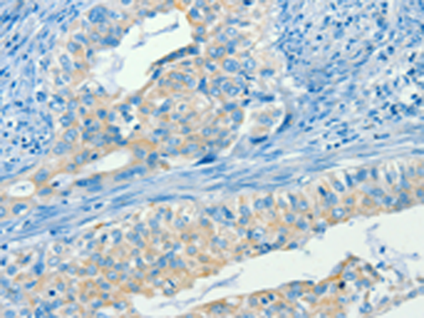 The image is immunohistochemistry of paraffin-embedded Human cervical cancer tissue using P11526(SERPINA9 Antibody) at dilution 1/60. (Original magnification: ×200) |