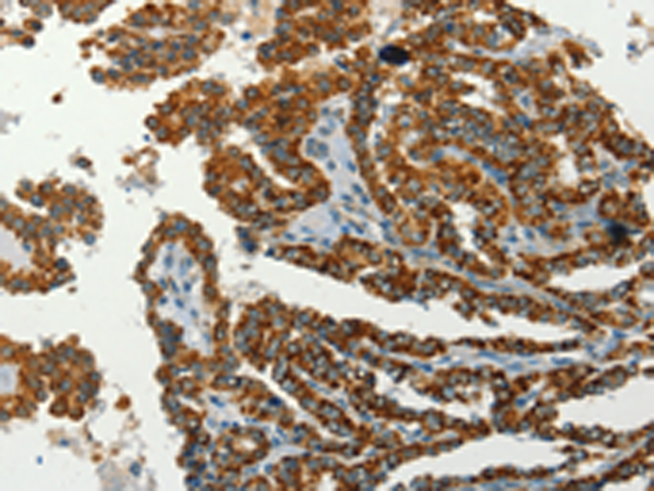 The image is immunohistochemistry of paraffin-embedded Human thyroid cancer tissue using P04647(SERPINA9 Antibody) at dilution 1/60. (Original magnification: ×200) |