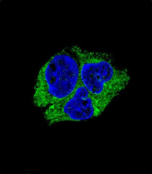 Confocal immunofluorescent analysis of SERPINI1 Antibody (N-term)(Cat#P30762) with HepG2 cell followed by Alexa Fluor® 488-conjugated goat anti-rabbit lgG (green). DAPI was used to stain the cell nuclear (blue). |